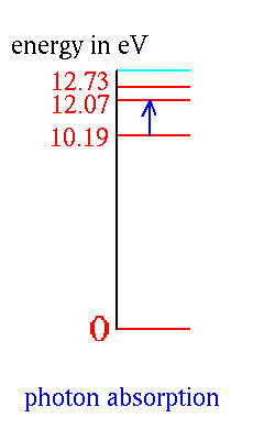 διευκρινιστούν με ένα διάγραμμα: Αυτή η εικόνα παρουσιάζει τέσσερα χαμηλότερα ενεργειακά επίπεδα. Υπάρχουν περισσότεροι. Οι ενέργειες επάνω από την μπλε γραμμή (~ 13,6 eV) είναι δυνατές επίσης. Αυτός αντιστοιχεί στην αφαίρεση του ηλεκτρονίου από το άτομο υδρογόνου (ιονίζοντας το άτομο, που κάνει το ένα ιόν). Οι ενέργειες για ένα ηλεκτρόνιο που δεν είναι συνδεμένο με το άτομο μπορούν να είναι τίποτα. Κατά συνέπεια οποιαδήποτε ενέργεια επάνω από την ενέργεια ιονισμού επιτρέπεται. Προς το παρόν παραμελούμε αυτό για να κρατήσουμε τη συζήτηση απλή.