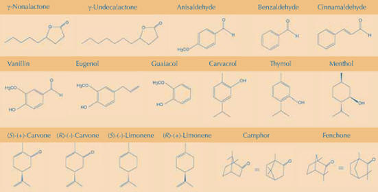 Παρόλα αυτά υπάρχουν συστατικά που είναι άσχετα δομικά αλλά μυρίζουν παρόμοια. Το κυκλοοκτάνιο, η καμφορά και η 1,8-κινεόλη έχουν και τα τρία οσμή καμφοράς, ενώ το κυκλοοκτάνιο αποτελείται από έναν ισοκυκλικό δακτύλιο (C8H16) και η καμφορά και η 1,8-κινεόλη είναι και τα δύο δικυκλικά μόρια με χαρακτηριστική ομάδα που περιέχει οξυγόνο. Η γνωστή ‘πράσινη πινελιά’ των άγουρων φρούτων και λαχανικών, που προστίθεται στα καλλυντικά για μια αίσθηση φρεσκάδας, προέρχεται από μια ομάδα στενά συνδεδεμένων C6 αλδεϋδων (cis-3-εξενάλη: φρέσκες ντομάτες ˙ cis-2-εξενάλη: πράσινα μήλα ˙ trans-2-εξενάλη: πράσινο και μαύρο τσάι, φρέσκες ντομάτες). Με τον ίδιο τρόπο, η αλκοόλη cis-3-εξενόλη (φρεσκοκομμένο γρασίδι ), the C9 αλδεΰδη 2-trans-6-cis-εναδιενάλη (φλούδα αγγουριού), μία αλδεΰδη συνδεδεμένη σε ένα δακτύλιο (λιγούστρο) και ακόμη μερικά πυραζόλια (2-προπύλ-3-μεθοξυπυραζόλιο: ποικιλία πιπεριάς ) έχουν αυτή την πράσινη πινελιά. Τα φυτά είναι η αρωματοποιία της φύσης