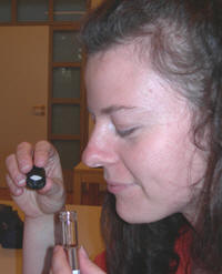 OΥποδοχείς οσμών Μερικά από τα πιο γοητευτικά χαρακτηριστικά της φυσιολογίας των οσμών ανακαλύφθηκαν από τους Linda Buck και Richard Axel, νικητές του βραβείου Νόμπελ το 2004. Σ’ αντίθεση με το απλό αλλά εξειδικευμένο μοντέλο κλειδιού-κλειδαριάς που κυβερνάει τη γεύση, η όσφρηση διακατέχεται από ένα σύνολο αισθητήριων κυττάρων. Ένας τύπος αρωματικών μορίων αντιδρά με περισσότερους από έναν τύπο υποδοχέων, και έτσι η συνολική αίσθηση σχηματίζεται από το συνδυασμό των ενεργών υποδοχέων. Όταν δοκίμασαν μία σειρά αλειφατικών n-αλκοολών σε μεμονωμένους νευρώνες ποντικών, ο Buck και οι συνεργάτες του ανακάλυψαν ότι ομάδες οσφρητικών νευρώνων ενεργοποιήθηκαν. Για παράδειγμα, η πεντανόλη ερέθισε ελάχιστα τον υποδοχέα S3 ˙η εξανόλη ενεργοποίησε δυνατά τους S3 και S25˙ η επτανόλη τους S3, S19 και S25˙ η οκτανόλη S18, S19, S41 and S51˙ και η ενανόλη τους S18, S19, S41, S51 και S83. Επομένως, μία οσμή αναγνωρίζεται εξειδικευμένα από πολλαπλούς οσφρητικούς υποδοχείς που εργάζονται σε συνδυασμό. Ένα τέτοιο μοντέλο ενεργοποίησης υποδοχέων δημιουργεί ένα μεγάλο ρεπερτόριο διακριτών οσμών. Επομένως, υπολογίζεται ότι μπορούμε να αναγνωρίσουμε περίπου χίλιες μυρωδιές και να διακρίνουμε περισσότερες μεταξύ μιας σειράς μεγέθους, με βάση την ηλικία μας, την εμπειρία και την φυσική ευαισθησία μας. Οι γλωσσολογική μας ικανότητα να ορίζουμε τις οσμές, όμως, βρίσκεται πολύ πίσω από την ικανότητα της μύτης μας να τις αναγνωρίζει. Για παράδειγμα, διαλυμένα αιθέρια έλαια ή απομονωμένα συστατικά που αντιπροσωπεύουν κάποιο άρωμα, εφαρμόζονται πάνω σε μια ταινία διηθητικού χαρτιού και τοποθετούνται σε ένα βιδωτό γυάλινο μπουκαλάκι (δείτε παρακάτω).